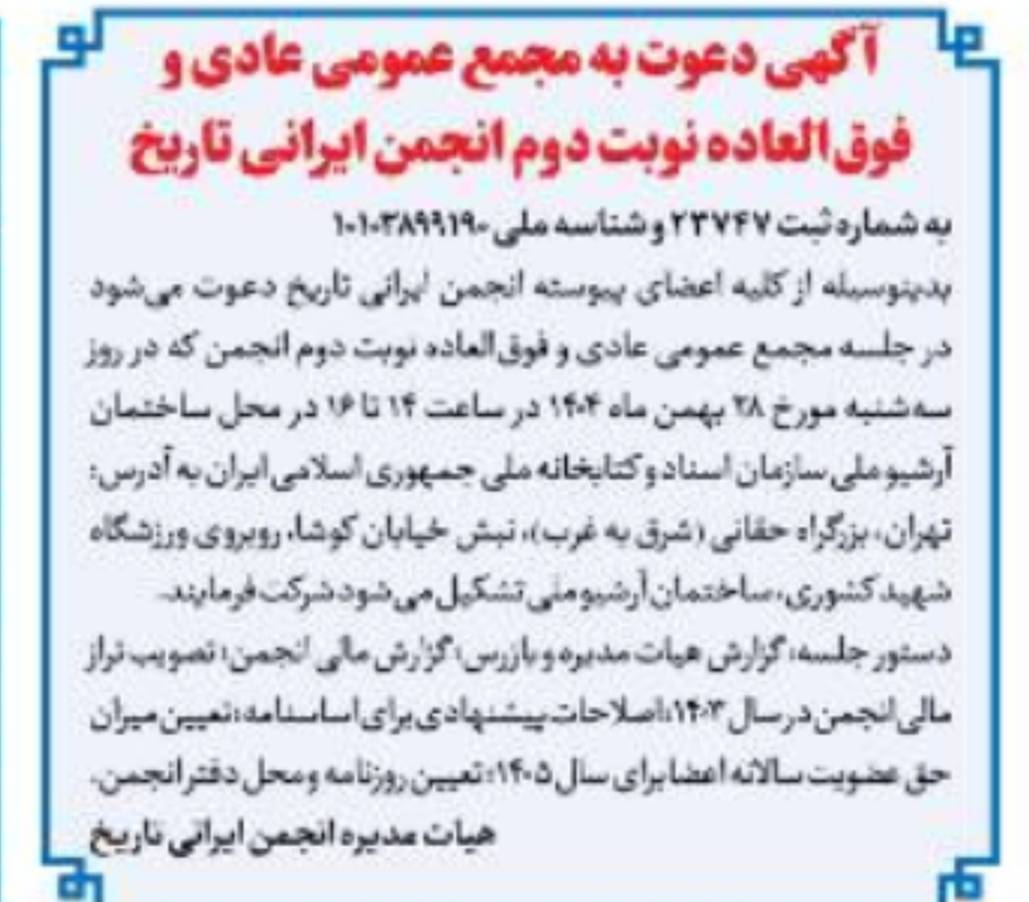 بدین وسیله از کلیه اعضای پیوسته انجمن ایرانی تاریخ دعوت میشود در جلسه مجمع عمومی عادی و فوقالعاده نوبت دوم انجمن که در روز سهشنبه مورخ 28 بهمن ماه 1404 در ساعت 14 تا 16 در محل ساختمان آرشیو ملی سازمان اسناد و کتابخانه ملی جمهوری اسلامی ایران به آدرس: تهران، بزرگراه حقانی (شرق به غرب)، نبش خیابان کوشا، روبروی ورزشگاه شهید کشوری، ساختمان آرشیو ملی تشکیل میشود شرکت فرمایند.
