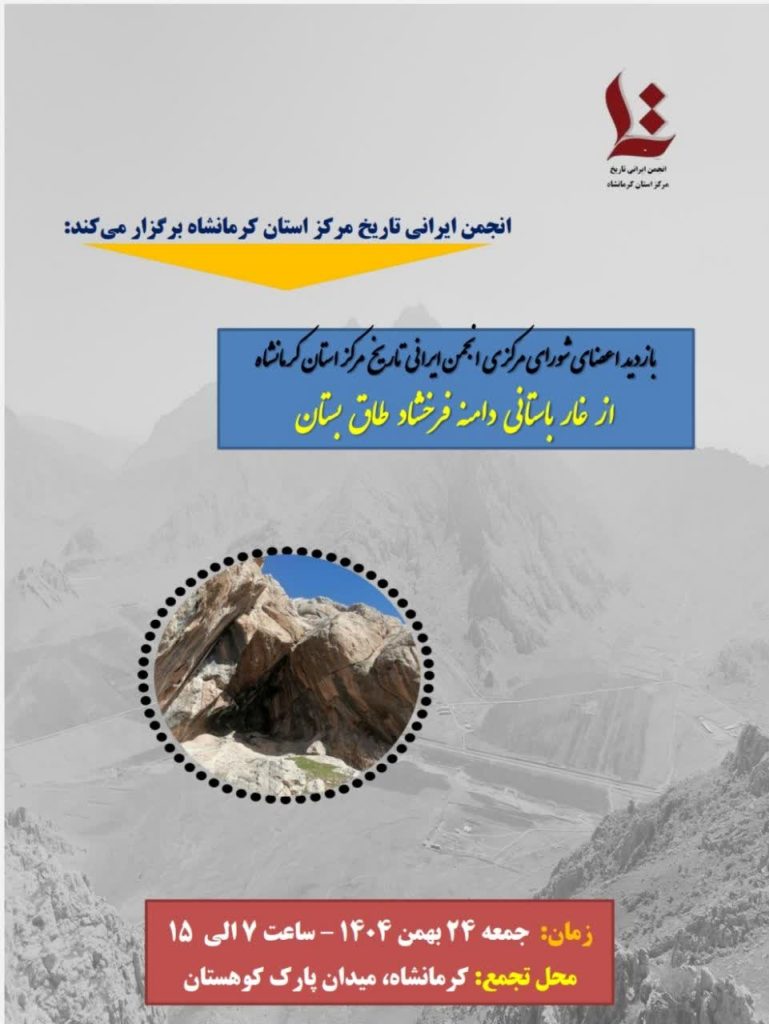 تعدادی از اعضای شورای مرکزی انجمن ایرانی تاریخ مرکز استان کرمانشاه در تاریخ جمعه 24 بهمن 1404 ساعت 7 الی 15 از ارتفاعات باستانی دوران پارینهسنگی طاق بستان و غار دامنه فرخشاد کرمانشاه بازدید نمودند. دکتر سجاد دادفر، مدیر گروه علوم تاریخی دانشگاه رازی ضمن بازدید، دقایقی راجع به آثار کشف شده از این غار توسط باستانشناسان سخن گفتند.