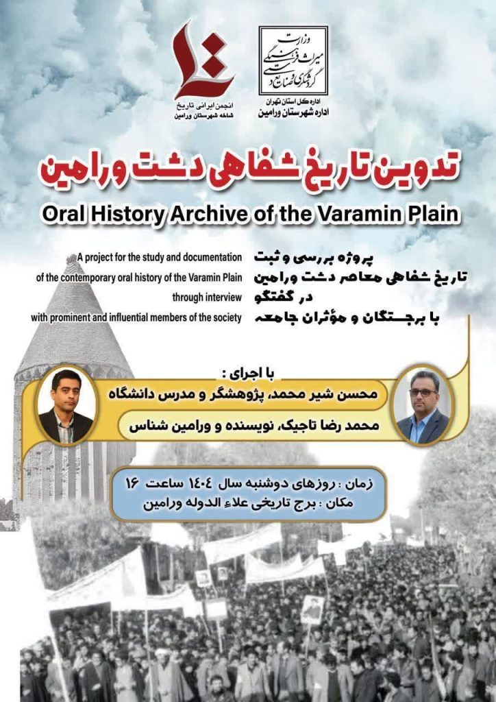 01 دی اخبار, اخبار شعب انجمن, شاخه ورامین, شعبه شهرستانهای استان تهران آغاز پروژه تدوین تاریخ شفاهی دشت ورامین 1 دی 1404 توسط history-admin 0 دیدگاه با همکاری انجمن ایرانی تاریخ شاخه شهرستان ورامین آغاز شد: تدوین تاریخ شفاهی دشت ورامین پروژه بر...ادامه مطلب