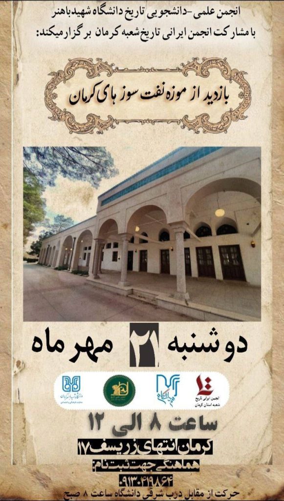 20 مهر اخبار, اخبار شعب انجمن, شعبه کرمان بازدید از موزه نفتسوزهای کرمان 21 مهر 1404 توسط history-admin 0 دیدگاه با مشارکت انجمن ایرانی تاریخ شعبه کرمان برگزار میشود: بازدید از موزه نفتسوزهای کرمان زمان: ...ادامه مطلب