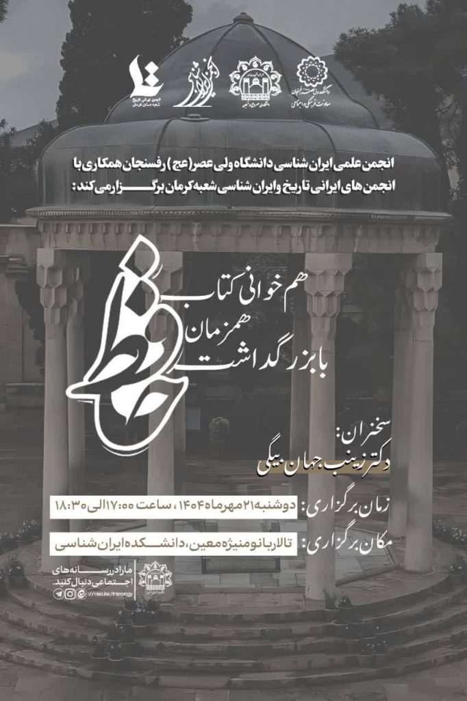 19 مهر اخبار, اخبار شعب انجمن, شعبه کرمان آئین بزرگداشت لسان الغیب؛ حافظ شیرازی در سه آئینه: ادبی، روانشناختی و تاریخی 21 مهر 1404 توسط history-admin 0 دیدگاه با همکاری انجمن ایرانی تاریخ شعبه کرمان برگزار میشود: آئین بزرگداشت لسان الغیب؛ حافظ شیرازی در ...ادامه مطلب