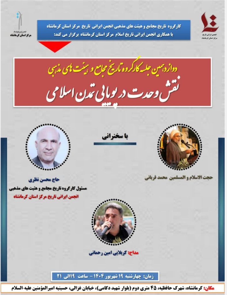 17 شهریور اخبار, اخبار شعب انجمن, شعبه كرمانشاه دوازدهمین جلسه کارگروه تاریخ مجامع و هیئتهای مذهبی؛ نقش وحدت در پویایی تمدن اسلامی 29 شهریور 1404 توسط history-admin 0 دیدگاه کارگروه تاریخ مجامع و هیئتهای مذهبی انجمن ایرانی تاریخ مرکز استان کرمانشاه با همکاری انجمن ایرانی...ادامه مطلب