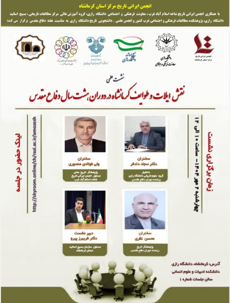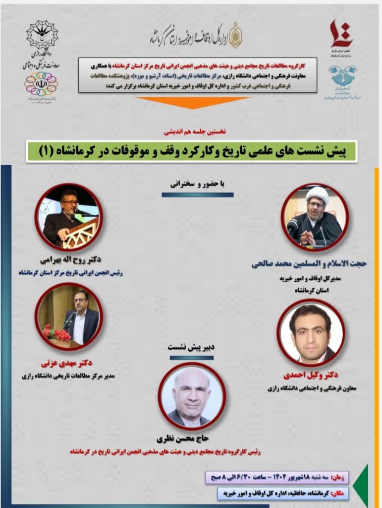 16 شهریور اخبار, اخبار شعب انجمن, شعبه كرمانشاه پیشنشستهای علمی تاریخ و کارکرد وقف و موقوفات در کرمانشاه (1) 29 شهریور 1404 توسط history-admin 0 دیدگاه با همکاری انجمن ایرانی تاریخ مرکز استان کرمانشاه برگزار میشود: پیشنشستهای علمی تاریخ و کارکرد ...ادامه مطلب