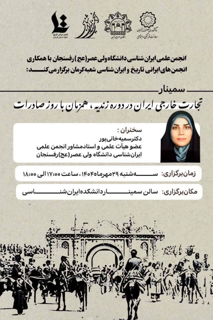 28 مهر اخبار, اخبار شعب انجمن, شعبه کرمان سخنرانی علمی تجارت خارجی ایران در دوره زندیه 28 مهر 1404 توسط history-admin 0 دیدگاه باهمکاری انجمن ایرانیتاریخ شعبه استان کرمان و به مناسبت روز صادرات برگزار میشود: سخنرانی علمی ...ادامه مطلب