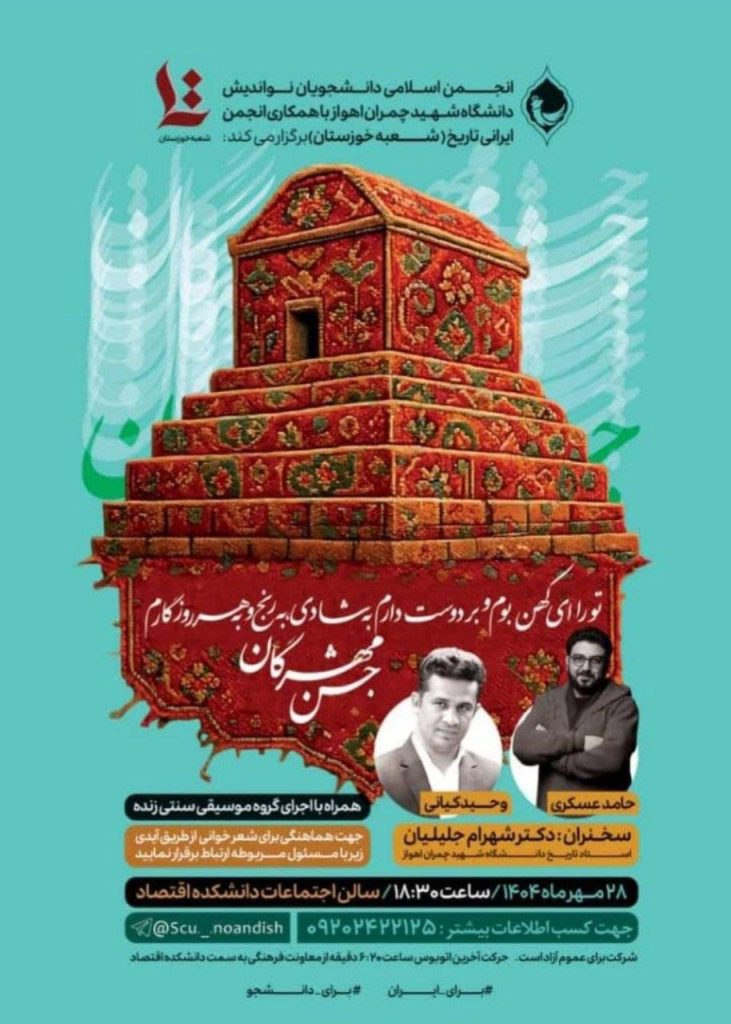 28 مهر اخبار, اخبار شعب انجمن, شعبه خوزستان گرامیداشت جشن مهرگان 28 مهر 1404 توسط history-admin 0 دیدگاه با همکاری انجمن ایرانی تاریخ شعبه خوزستان برگزار میشود: گرامیداشت جشن مهرگان سخنران: دکتر ش...ادامه مطلب