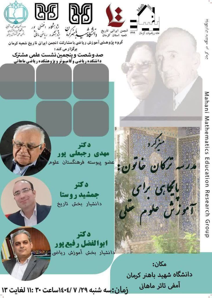 28 مهر اخبار, اخبار شعب انجمن, شعبه کرمان میزگرد علمی مدرسه ترکان خاتون: پایگاهی برای آموزش علوم عقلی 28 مهر 1404 توسط history-admin 0 دیدگاه با همکاری انجمن ایرانی تاریخ شعبه استان کرمان برگزار میگردد: میزگرد علمی مدرسه ترکان خاتون: پای...ادامه مطلب