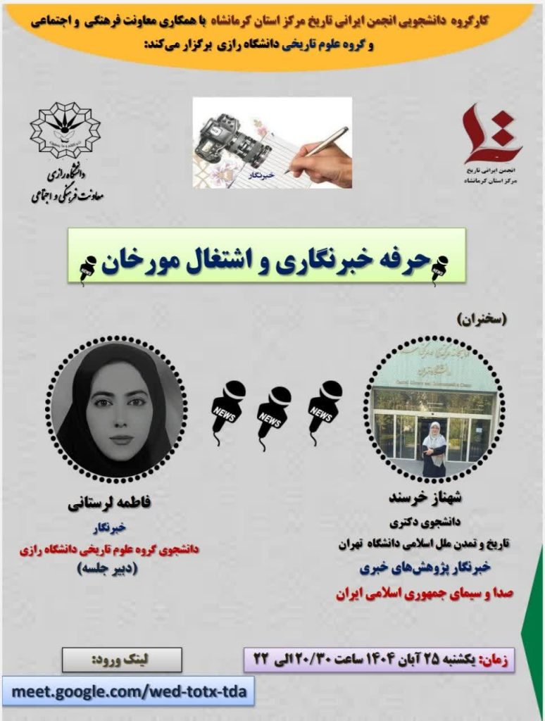 23 آبان اخبار, اخبار شعب انجمن, شعبه كرمانشاه سخنرانی با موضوع حرفه خبرنگاری و اشتغال مورخان 23 آبان 1404 توسط history-admin 0 دیدگاه کارگروه دانشجویی انجمن ایرانی تاریخ مرکز استان کرمانشاه با همکاری معاونت فرهنگی و اجتماعی و گروه ع...ادامه مطلب