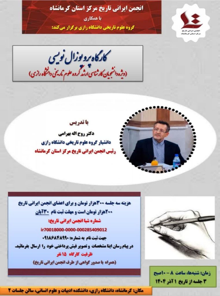 27 آبان اخبار, اخبار شعب انجمن, شعبه كرمانشاه کارگاه پروپوزالنویسی 27 آبان 1404 توسط history-admin 0 دیدگاه انجمن ایرانی تاریخ مرکز استان کرمانشاه با همکاری گروه علوم تاریخی دانشگاه رازی برگزار میکند: ک...ادامه مطلب
