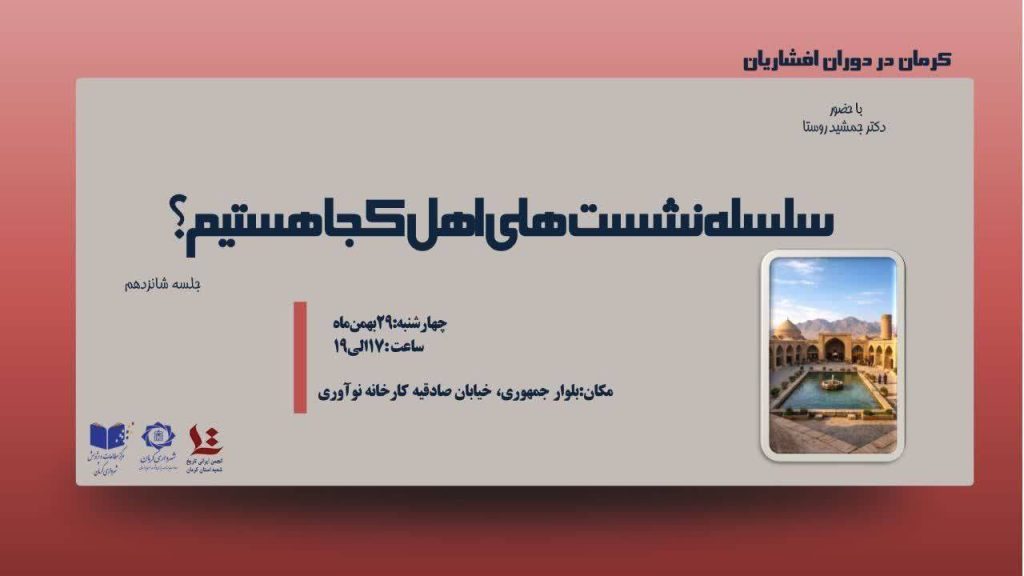 28 بهمن اخبار, اخبار شعب انجمن, شعبه کرمان نشست تخصصی بررسی وضعیت سیاسی، اجتماعی و فرهنگی کرمان در دوران افشاریان 30 بهمن 1404 توسط history-admin 0 دیدگاه با همکاری انجمن ایرانی تاریخ شعبه استان کرمان برگزار میشود: سلسلهنشستها (کارگاه) «اهل کجا هستی...ادامه مطلب