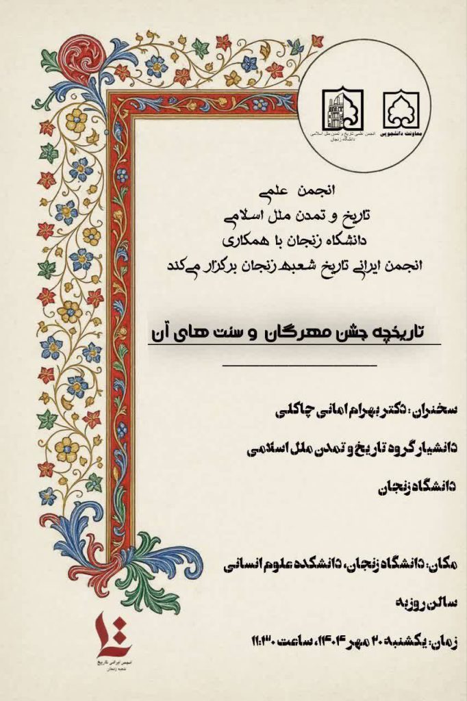 18 مهر اخبار, اخبار شعب انجمن, شعبه زنجان سخنرانی علمی تاریخچه جشن مهرگان و سنتهای آن 18 مهر 1404 توسط history-admin 0 دیدگاه با همکاری انجمن ایرانی تاریخ شعبه زنجان برگزار میشود: سخنرانی علمی تاریخچه جشن مهرگان و سنتهای...ادامه مطلب