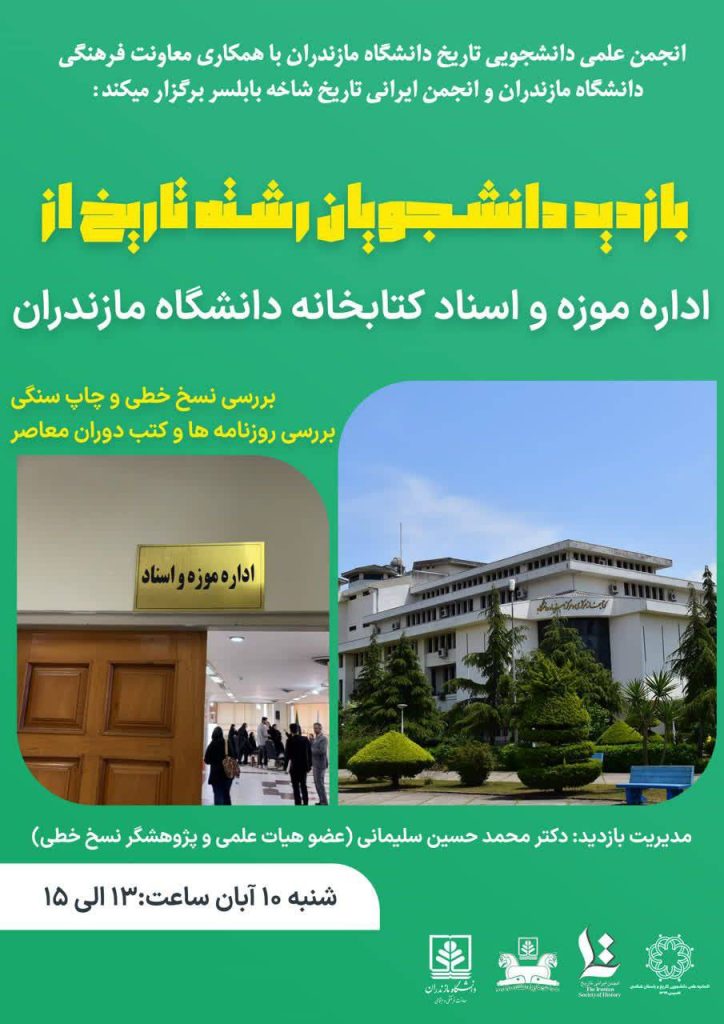 08 آبان اخبار, اخبار شعب انجمن, شاخه بابلسر, شعبه مازندران بازدید دانشجویان تاریخ از اداره موزه و اسناد کتابخانه دانشگاه مازندران 15 آبان 1404 توسط history-admin 0 دیدگاه با همکاری انجمن ایرانی تاریخ شاخه بابلسر برگزار میشود: بازدید دانشجویان تاریخ از اداره موزه و اس...ادامه مطلب