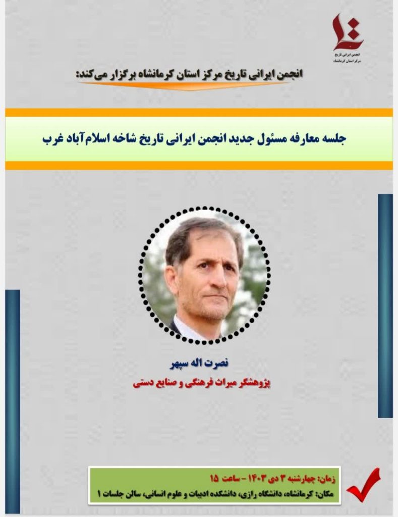 02 دی اخبار, اخبار شعب انجمن, شاخه اسلام آباد غرب, شعبه كرمانشاه جلسه معارفه مسئول جدید انجمن ایرانی تاریخ شاخه اسلامآباد غرب 6 دی 1404 توسط history-admin 0 دیدگاه انجمن ایرانی تاریخ مرکز استان کرمانشاه برگزار میکند: جلسه معارفه مسئول جدید انجمن ایرانی تاریخ ش...ادامه مطلب