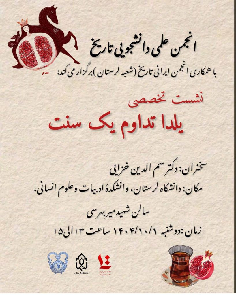28 آذر اخبار, اخبار شعب انجمن, شعبه لرستان نشست تخصصی: یلدا تداوم یک سنت 6 دی 1404 توسط history-admin 0 دیدگاه با همکاری انجمن ایرانی تاریخ شعبه لرستان برگزار میشود: نشست تخصصی: «یلدا تداوم یک سنت» سخنران...ادامه مطلب